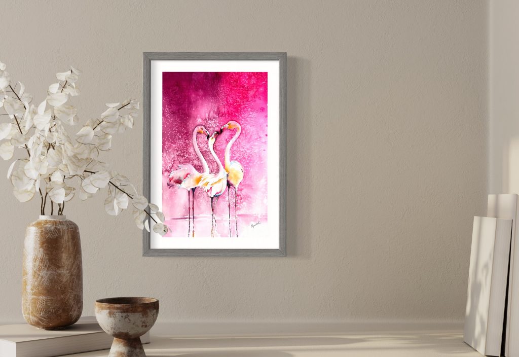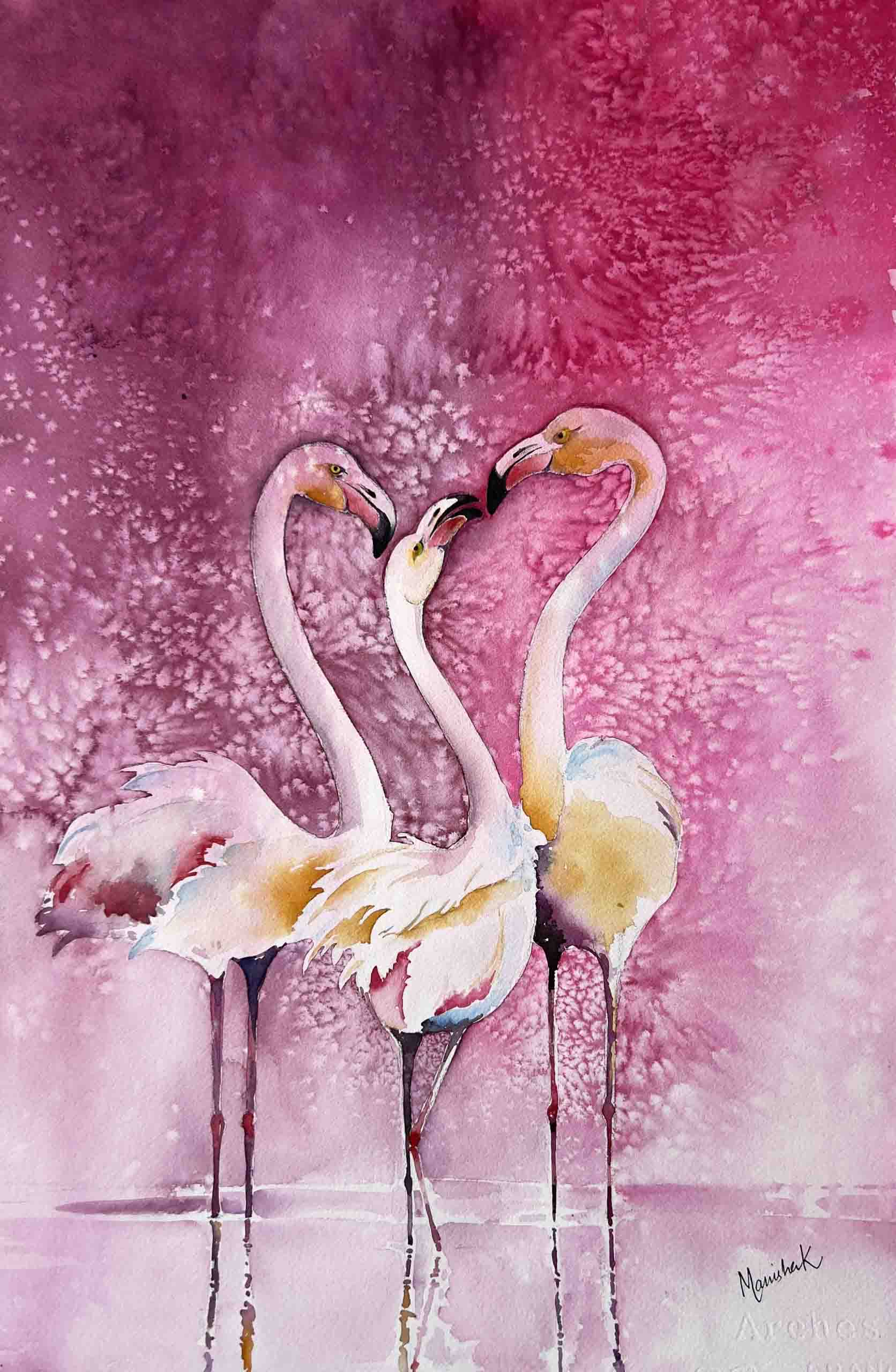 The flamingos are migratory birds, flying over continents and oceans in huge flocks. This painting portrays/reminds of meeting with old friends, who grow up together as inseparable, and then life happens, with hundreds of miles between them, they forget what they meant to each other. Until one-day destiny brings them together again –The Pink symbolises femininity. Selected for international exhibition Fabriano in Acquarello 2020-21.